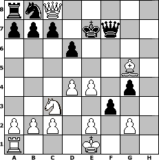 game notation in PGN-format [Event "Zwischendurch mal ein paar eigene Z"] [Site "www.myChess.de"] [Date "2009.06.25"] [Round "1"] [White "espero"] [Black "Juliette2103"] [ECO "C33"] [WhitemyELO "1663"] [BlackmyELO "1495"] [Result "1-0"] [TimeControl "10/1728000"] [WhiteDays "33"] [BlackDays "07"] [MyChessNo "56870"] 1. e4 e5 2. f4 exf4 3. Bc4 d6 4. Nc3 h6 5. d4 g5 6. h4 Bg7 7. hxg5 hxg5 8. Rxh8 Bxh8 9. Qh5 Qf6 10. Nf3 g4 11. Ng5 Nh6 12. Nxf7 Nxf7 13. Bxf7+ Qxf7 14. Qxh8+ Ke7 15. Qxc8 f3 16. Bg5+ 1-0 position notation in FEN-format rnQ5/ppp1kq2/3p4/6B1/3PP1p1/2N2p2/PPP1P1P1/R3K3 - Q - 1 16 Captured white pieces: Captured black pieces: Click on a captured piece in order to display the desired move!