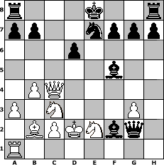 game notation in PGN-format [Event "READY TO RUMBLE!!!"] [Site "www.myChess.de"] [Date "2004.01.27"] [Round "1"] [White "k2piet"] [Black "Blacky"] [ECO "B00"] [WhitemyELO "1360"] [BlackmyELO "1493"] [Result "0-1"] [TimeControl "10/3456000"] [WhiteDays "00"] [BlackDays "76"] [MyChessNo "2046"] 1. e4 Nc6 2. f4 e5 3. fxe5 Nxe5 4. d4 Qh4+ 5. g3 Qxe4+ 6. Ne2 Qxh1 7. dxe5 Qxh2 8. Nbc3 Bc5 9. Qd5 Qf2+ 10. Kd1 Qxf1+ 11. Kd2 d6 12. exd6 cxd6 13. a3 Ne7 14. Qc4 Bf5 15. b4 Bf2 16. Bb2 Qg2 0-1 position notation in FEN-format r3k2r/pp2nppp/3p4/5b2/1PQ5/P1N3P1/1BPKNbq1/R7 - kq - 3 17 Captured white pieces: ![]() ![]() ![]() ![]() ![]() ![]() ![]() ![]() ![]() ![]() ![]() ![]() ![]() ![]() ![]() Captured black pieces: ![]() ![]() ![]() ![]() ![]() ![]() ![]() ![]() ![]() ![]() ![]() ![]() ![]() ![]() ![]() Click on a captured piece in order to display the desired move!